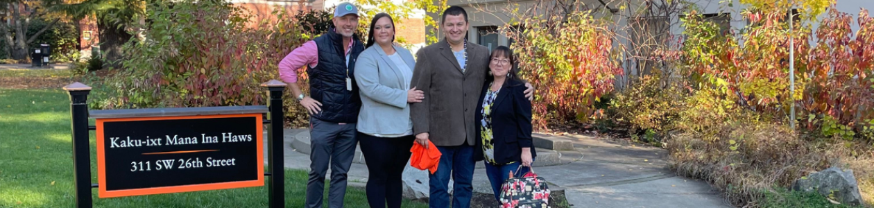 Deputy Director of Tribal Government Alicia McAuley, Education Programs Officer Jesse Jackson, Chief Operations Officer of Umpqua Ventures Travis Hill, and Cultural Resources Manager Jennifer Bryant visited the Ina Haws for the special ceremony in November.