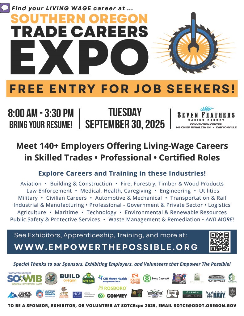 In 2023, I attended the Southern Oregon Trade Careers Conference and was impressed by the number of employers, vendors, and trade program representatives present. This career fair returns to Seven Feathers Casino Resort this Fall, and is an ideal opportunity for current or curious job seekers to learn about training programs and explore employment opportunities with top employers across the region and state. There are so many vendors to connect with, from government to private sector services. Every demographic, including high school students, adults, active military/veterans, and their spouses are encouraged to attend!